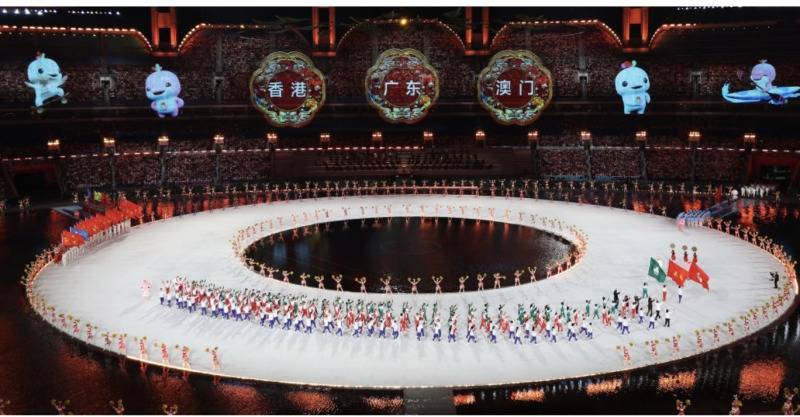 11月9日启云科技,广东省体育代表团、香港特别行政区体育代表团和澳门特别行政区体育代表团在入场仪式上共同入场。当日,第十五届全国运动会开幕式在广东奥林匹克体育中心举行。新华社记者 卢汉欣 摄
