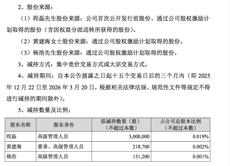 记者注意到,拟减持的高管均持有通过股权激励取得的股份。其中,高管程磊计划减持不超过300万股,占公司总股本的0.019%大发配资,其股份来源包括公司首次公开发行前股份及通过股权激励计划取得的股份(含权益分派送转股份);董事、高管黄建海计划减持不超过21.87万股,占总股本0.002%;高管杨浩计划减持不超过13.12万股,占总股本0.001%,后两者股份均来自公司股权激励计划。