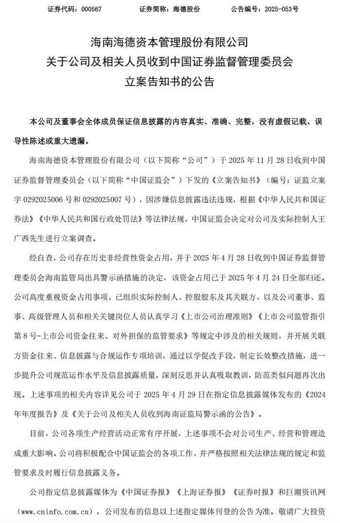 海德股份表示,经自查,公司存在历史非经营性资金占用,并于2025年4月28日收到中国证监会海南监管局出具警示函措施的决定,该资金占用已于2025年4月24日全部归还。